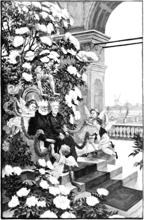 ELDER-TREE MOTHER TOOK TWO FLOWERS FROM HER WREATH AND PLACED THEM ON THE HEADS OF THE OLD COUPLE, WHEN EACH FLOWER BECAME A GOLDEN CROWN.