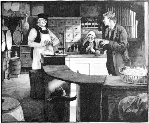 One evening the student came in through the back door to buy some candles and cheese; he had no one to send, so he went himself. He got what he asked for and paid for it, and the butterman and his wife nodded "good night" to him—she, by the by, could do more than nod to people, for she was gifted with a glib tongue—and the student nodded in return, but stopped to read the piece of paper in which the cheese was
