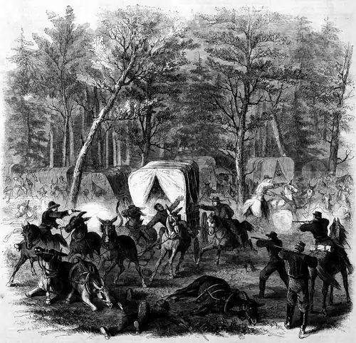 "Our forces," says our Artist, "were driven in confusion down the hill, through, the clearing and into the woods. The overwhelming force of the enemy, attacking from every quarter simultaneously, prevented all effectual resistance. Gen. Lee lost 150 wagons, with 10 days rations, 900 mules, many horses, etc. The officers lost all their private baggage."