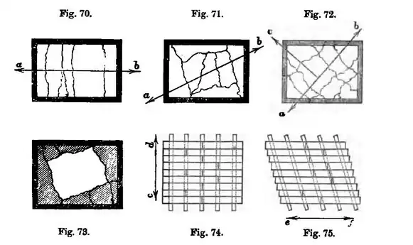 detached, and would fall, leaving other portions, as in Fig. 73, still adherent and supported by the walls; while in the first case, if the width transverse to — (Fig. 70) were sufficient, the segments detached by the parallel fractures, would break again transversely, by their own weight at or near the mid-length, and also close to the walls, and then fall.