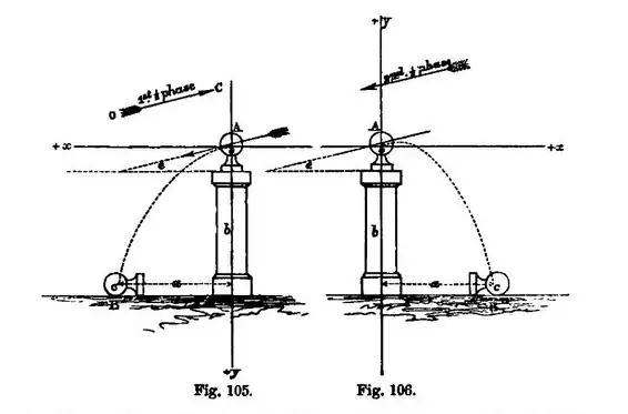 be thrown from its place by the earthquake wave in its first semiphase (direct shock), in the direction of wave-path , and be found projected to the ground at , in a direction contrary to the wave transit. It is required, if the angle of emergence , of the wave-path at the place, be known, to determine the velocity of projection, and vice versâ. The