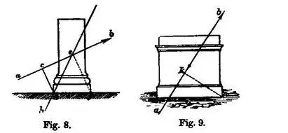 In fact, no velocity of earth wave occurring in nature, even with the emergent angle , i.e., horizontally, could overturn a block proportioned as in Fig. 6. If resting on a bed of earth or stone, it might slide and plough along upon it, and knowing certain coefficients, the length and dimensions of the channel or course cut by it would enable the wave velocity to be arrived at. In the case of the other block (Fig. 7), however, it would be overturned by a wave emergent in the direction to in either semiphase of the wave, the forces of overthrow in each being proportionate to and . So in more regular solids, the column shaft (Fig. 8) may be overturned by a sufficient velocity of wave, in either semiphase, emergent at any angle between , passing through the centre of gravity and the horizontal wave-
