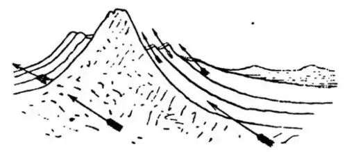 the wave thus "breaking" upon the slope of the central formations, like a ripple upon a sea-beach; while such portion of it as passes deeper, and through the innermost axial formation, will emerge at the outgoing flank, (to the left,) after having sustained all the losses of vis vivâ and volume already described, by change of medium, refraction, and reflection.
