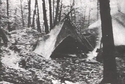 To set it up, cut three small saplings one of which should be twelve feet long and the other two, ten feet long. Tie these two together at the ends making what the sailors call a "shears." Take the twelve-foot pole and run it down the ridge inside the tent, and out through the hole in the back. Now raise the ridge pole with one end stuck in the ground and the front end resting on the two shear poles and tie all three of them together. At the end of each seam the hem you must work in a little eyelet hole for a short piece of twine to tie to the tent pegs. Stretch out the back triangle, pegging it down at the two corners