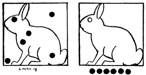 Take two six-inch squares of stiff white pasteboard or whitened wood. On each of these draw an outline rabbit, one an exact duplicate of the other. Make twenty round black wafers