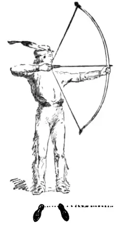 The Indians made arrows of reeds and of straight shoots of viburnum or arrow-wood, and of elder, but we make better arrows out of the solid heartwood of hard pine for target use, and of hickory or ash for hunting. The arrow should be twenty-five inches long, round, and three eighths of an inch thick, and have three feathers set as shown in Cut VI, about an inch from the notch. The feather B, that stands out at right angles to notch A, should always be away from the bow in shooting.