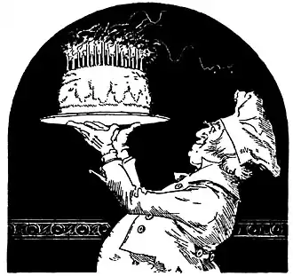 The three cooks, too astonished for speech, and with staring eyes, pointed to the center table. The great, gorgeous birthday cake was gone, though not two sec-