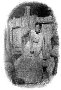 pulverises the grain sufficiently for the coarse cakes which serve in lieu of bread.