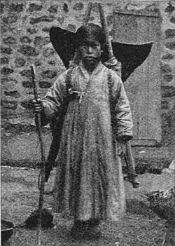The inhabitants of the Hermit Kingdom are peculiarly proficient in the art of doing nothing gracefully. There is, therefore, infinite charm and variety in the daily life of Korea. The natives take their pleasures passively, and their constitutional incapacity makes it appear as if there were little to do but to indulge in a gentle stroll in the brilliant sunshine, or to sit cross-legged within the shade of their houses. Inaction becomes them; nothing could be more unsuited to the character of their peculiar costume than vigorous movement. The stolid dignity of their appearance and their stately demeanour adds vastly to the picturesqueness of the street scenes. The white-coated, white-trousered, white-socked, slowly striding population is irresistibly fascinating to the eye. The women are no less interesting than the men. The unique fashion of