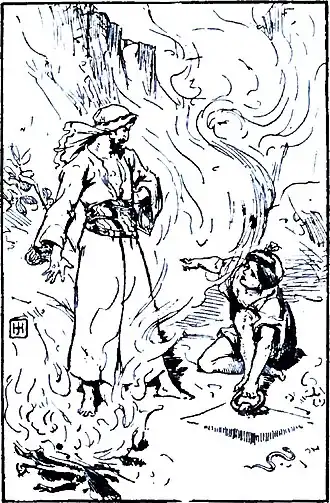 led him on in spite of himself. At last they came to two mountains divided by a narrow valley. ‘We will go no farther,’ said the false uncle. ‘I will show you something wonderful; only do you gather up sticks while I kindle a fire.’