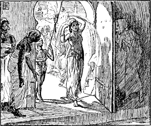 One day Aladdin heard an order from the Sultan proclaimed that everyone was to stay at home and close his shutters while the Princess, his daughter, went to and from the bath. Aladdin was seized by a desire to see her face, which was very difficult, as she always went veiled. He hid himself behind the door of the bath, and peeped through a chink. The Princess lifted her veil as she went in, and looked so beautiful that Aladdin fell in love with her at first sight. He went home so changed that his mother was frightened. He told her he loved the Princess so deeply that he could not live without her, and meant to ask her in marriage of her father. His mother, on hearing this, burst out laughing, but Aladdin at last prevailed upon her to go before the Sultan and carry his request. She fetched a napkin and laid in it the magic fruits from the enchanted garden, which sparkled and shone like the most beautiful jewels. She took these with her to please the Sultan, and set out, trusting in the lamp. The Grand Vizier and the lords of council had just gone in as she entered the hall and placed herself in front of the Sultan. He, however, took no notice of her.