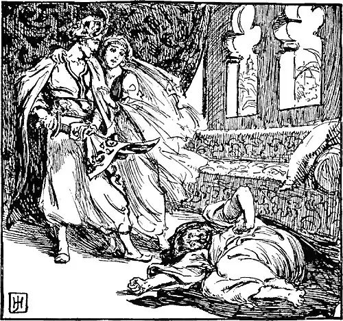 The false Fatima, who wished for nothing better, consented, but kept his veil down for fear of discovery. The Princess showed him the hall, and asked him what he thought of it. ‘It is truly beautiful,’ said the false Fatima. ‘In my mind it wants but one thing.’ ‘And what is that?’ said the Princess. ‘If only a roc’s egg,’ replied he, ‘were hung up from the middle of this dome, it would be the wonder of the world.’