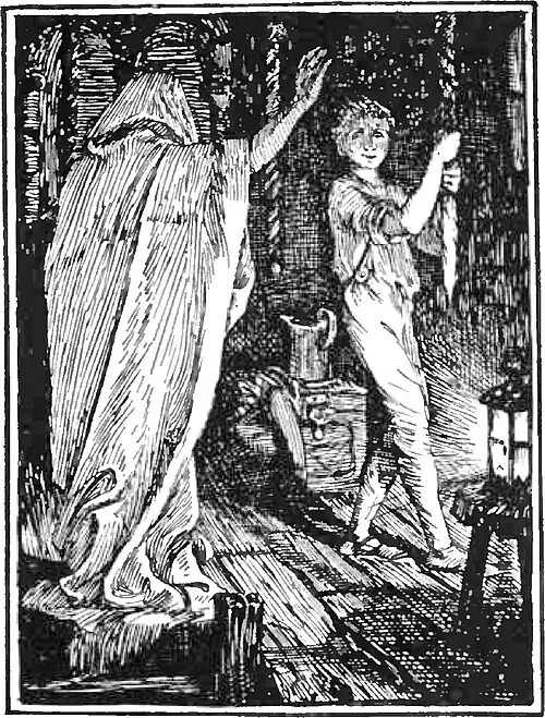‘Who’s there?’ he called out, but the figure gave no answer, and neither stirred nor moved. ‘Answer,’ cried the youth, ‘or begone; you have no business here at this hour of the night.’ But the sexton remained motionless, so that the youth