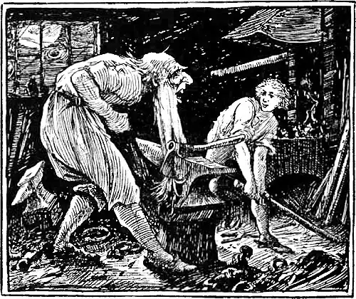 youth, and went to the other anvil. The old man drew near him in order to watch closely, and his white beard hung right down. Then the youth seized the axe, cleft the anvil open, and jammed in the old man’s beard. Now I have you,’ said the youth; ‘this time it’s your turn to die.’ Then he seized an iron rod and belaboured the old man till he, whimpering, begged him to leave off, and he would give him great riches.