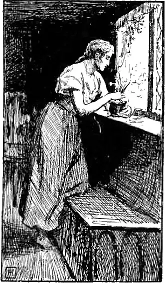 As she leant over them she noticed that they were very dry. So taking her pitcher, she ran off in the clear moonlight to the fountain, which was at some distance. When she reached it she sat down upon the brink to rest, but she had hardly done so when she saw a stately lady coming towards her, surrounded by numbers of attendants. Six maids of honour carried her train, and she leaned upon the arm of another.