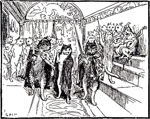 Presently he noticed that on the little paw that was next him the White Cat wore a bracelet containing a portrait, and he begged to be allowed to look at it. To his great surprise he found it represented an extremely handsome young man, who was so like himself that it might have been his own portrait! The White Cat sighed as he looked at it, and seemed sadder than ever, and the Prince dared not ask any questions for fear of displeasing her; so he began to talk about other things, and found that she was interested in all the subjects he cared for himself, and seemed to know quite well what was going on in the world. After supper they went into another room, which was fitted up as a theatre, and the cats acted and danced for their amusement, and