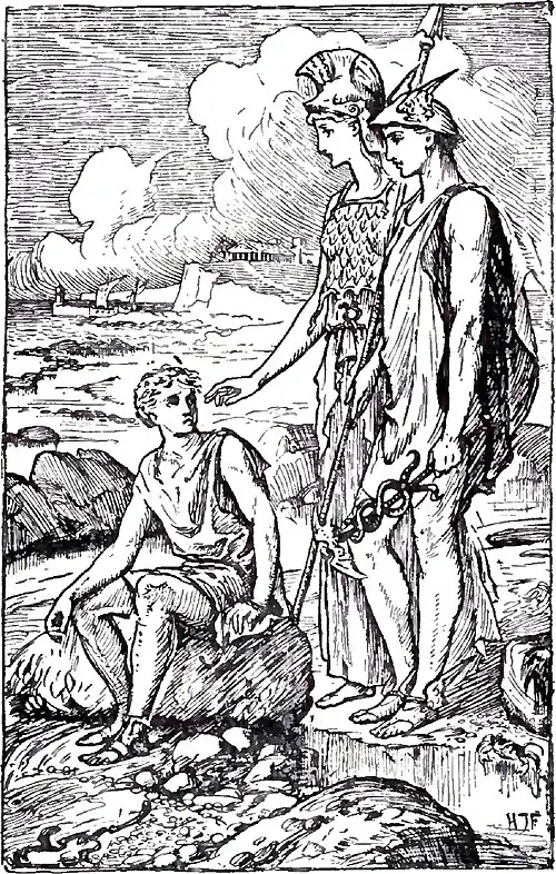 There he went and sat down on a rock, looking towards the sea, and wondering how he should begin to fulfil his vow. Then he felt some one touch him on the shoulder; and he turned, and saw a young man like a king’s son, having with him a tall and beautiful