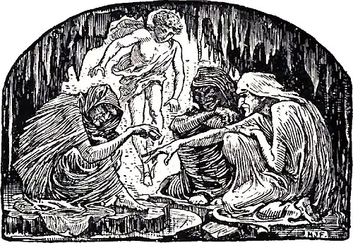 Their hair was as white as the snow, and their flesh of an icy blue, and they mumbled and nodded in a kind of dream, and their frozen breath hung round them like a cloud. Now the opening of the cave in the ice was narrow, and it was not easy to pass in without touching one of the Grey Sisters. But, floating on the Shoes of Swiftness, the boy just managed to steal in, and waited till one of the sisters said to another, who had their one eye: