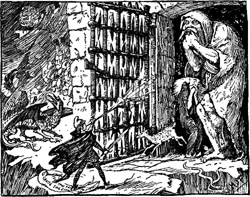When he had climbed to the top of the mountain he saw two fiery griffins; but he passed between them without the least fear of danger, for they could not see him because of his invisible coat. On the castle gate he found a golden trumpet, under which were written these lines:—