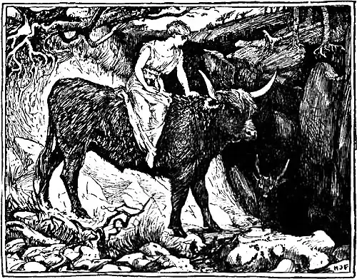 and ugsome glen, where they stopped, and the lady lighted down. Says the bull to her: ‘Here ye maun stay till I gang and fight the deil. Ye maun seat yoursel’ on that stane, and move neither hand nor fit till I come back, else I’ll never find ye again. And if everything round about ye turns blue I hae beaten the deil; but should a’ things turn red he’ll hae conquered me.’ She set hersel’ down on the stane, and by-and-by a’ round her turned blue. O’ercome wi’ joy, she lifted the ae fit and crossed it owre the ither, sae glad was she that her companion was victorious. The bull returned and sought for but never could find her.