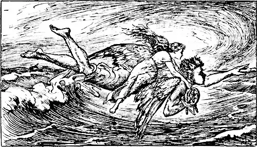 The North Wind woke her betimes next morning, and puffed himself up, and made himself so big and so strong that it was frightful to see him, and away they went, high up through the air, as if they would not stop until they had reached the very end of the world. Down below there was such a storm! It blew down woods and houses, and when they were above the sea the ships were wrecked by hundreds. And thus they tore on and on, and a long time went by, and then yet more time passed, and still they were above the sea, and the North Wind grew tired, and more tired, and at last so utterly weary that he was scarcely able to blow any longer, and he sank and sank, lower and lower, until at last he went so low that the crests of the waves dashed against the heels of the poor girl he was carrying. ‘Art thou afraid?’ said the North Wind. ‘I have no fear,’ said she; and it was true. But they