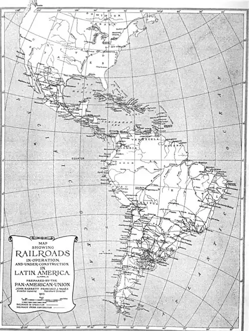 Map showing railroads in operation in South America—railroads shown by heavy black lines.