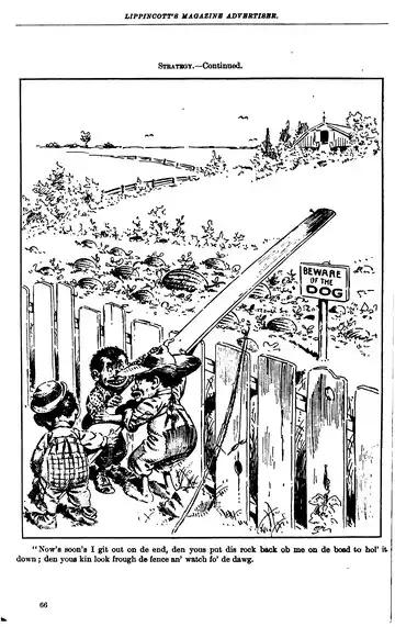 "Now's Soon's I git out on de end, den yous put dis rock back ob me on de boad to hol' it down; den yous kin look frough de fence an' watch fo' de dawg."