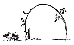 First Tish, with her book open in front of her, made a running noose out of one of the buckskin thongs. Next we bent down a sapling and tied the noose to it, 120