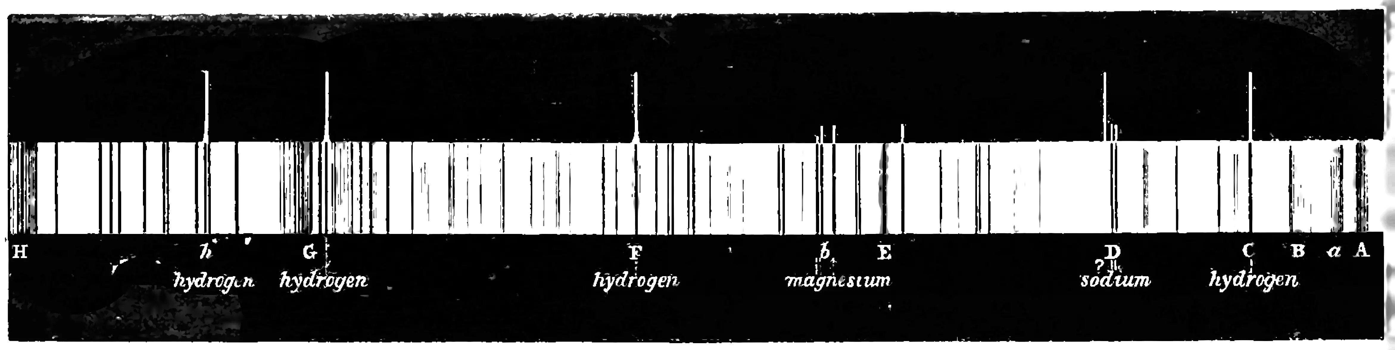 Fig 1.—Showing the solar spectrum, with the principal Fraunhofer lines, and above it the bright-line spectrum of a prominence containing magnesium, sodium, and iron vapour at its base.