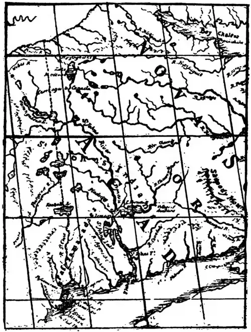 This was the map used in negotiating the Treaty of Paris, in 1783. The due north line of the American claim is shown by dots from Kousaki, or Grand Lake, at the head of the St. Croix, to the highlands south of the St. Lawrence.