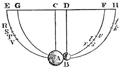 equal strings AC, BD, from the centres C, D. About these centres, with those intervals, describe the semicircles EAF, GBH, bisected by the radii CA, DB. Bring the body A to any point R of the arc EAF, and (withdrawing the body B) let it go from thence, and after one oscillation suppose it to return to the point V: then RV will be the retardation arising from the resistance of the air. Of this RV let ST be a fourth part, situated in the middle, to wit, so as RS and TV may be equal, and RS may be to ST as 3 to 2, then will ST represent very nearly the retardation during the descent from S to A. Restore the body B to its place: and, supposing the body A to be let fall from the point S, the velocity thereof in the place of reflexion A, without sensible error, will be the same as if it had descended in vacuo from the point T. Upon which account this velocity may be represented by the chord of the arc TA. For it is a proposition well known to geometers, that the velocity of a pendulous body in the lowest point is as the chord of the arc which it has described in its descent. After