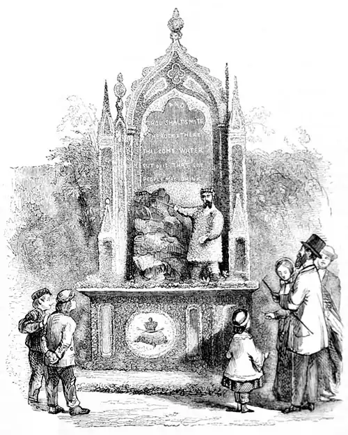 The designs of the other taps were not so ambitious. They both bore a certain resemblance to Grecian temples, with small fountains beneath their shade. These structures were composed of boards covered with clay, which was again overlaid with flowers. The petals only are used in this mosaic work, and the effect is very remarkable. Buttercups, blue-bells, pansies, the blossoms of the gorse, the sharp pointed leaves of the fir, mosses of various colours, geraniums, lilies of the valley, blossoms of the globe amaranthus, and the narcissus, were all impressed into the service.