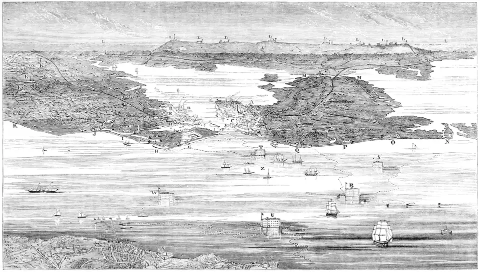 A. Portsmouth Lines; B. Gosport Lines; C. The Dockyard: D. The Victualling Yard; E. Point Battery; F. Block House Fort; G. Monkton Fort; H. Works on Gillkicker Point I. Works in Stokes’s Bay; J. J. J. &c. Chain of Forts (1825); K. K. &c. Chain of new Outworks; L. L. &c. Chain of new Outworks on Portsdown Hill; M. Hilsea Lines; N. Cumberland Fort; O. Eastney Fort; P. Lump’s Fort; Q. Southsea Castle; R. Horse Sand Fort; S. Intermediate Fort; T. Spit Sand Fort; U. No Man’s Land Fort; W. Sturbridge Fort; X. Appley House Battery; Y. Nettlestone Point Battery; Z. Spithead.