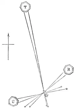 The scheme of defence now being put in force involves the erection on No Man’s Land, the Horse Sand, and Sturbridge, of three large forts; and on the Spit Sand and on the Horse, halfway between the large work and the mainland, of two smaller forts, whilst on shore a string of forts, called Cumberland (N), Eastney (O), and Lump’s Forts (P), and Southsea Castle (Q), combine with Point Battery (E), and the southern face of Portsmouth Lines in guarding the eastern approaches to the harbour, the protection of the western being provided for by Block House Fort (F), Fort Monkton (G), and batteries on Gillkicker Point (H), connected by works with the chain of forts west of Gosport, already described. Let us next proceed to consider what obstacles an attack by sea, from the most likely quarter, S.E., would have to encounter, from this system of defences. We will, as in the case of the Thames and Sheerness, imagine ourselves on board one of the attacking squadron. Our course lies past the Warner Light, shown in the right-hand lower corner of the engraving, our guiding marks being the odd-looking sea mark called the Kickergill, seen on shore abreast of the middle of Stokes Bay (I), as observed over Monkton Fort and the works hard by (H). Without taking much notice of the fact, that before we arrived at the Warner, we should have exposed ourselves to the fire of both Nettlestone Battery (Y), and another a mile to the southward, at St. Helen’s Point, but at a two mile range, we should, very soon after passing the Light ship, find ourselves in a position of which the diagram will give the best idea, whilst it at the same time will serve to elucidate the system of cross firing already treated of.