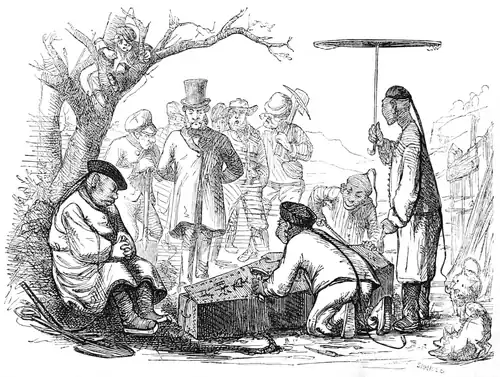 were then broken into short lengths—every particular bone—even the very skull was so broken up that it was difficult to make out the several component plates afterwards. These bones were then deposited in a wooden box about two feet long by one broad, and about one foot in depth, and lined throughout with white satin. There I saw them on my visit to the cemetery. The box lay on a table in the tool-house at the cemetery gates. It was really hard to say which was whiter, the white satin or the white calcined bone heaped up within it. Although thoroughly burned, none of the integral structure of the bone was destroyed, and the spongy texture of the heads of the thigh bones, &c., presented a really beautiful appearance. In a corner of this wooden funeral urn—if I may be pardoned for the bull—lay a small octagonal tin box marked “matches,” and the manufacturer would have stared in amazement if he could only have foreseen its ultimate contents and destiny. The sexton gave me permission to open it and examine its contents. I did so, and I must confess my astonishment was quite as great as I could have fancied that of the tin match-box maker, could he only have peeped over my shoulder as I opened the lid. I had heard of silver urns before, containing hearts and so forth; but a tin match-box with such a lining was a matter I was little prepared for. On lifting the lid, I found within all the teeth of the deceased celestial together with his finger nails, which had been drawn out and off respectively, previous to the kiln-drying operation. The nails, it would appear, which were of the most absurd length, and more resembling the talons of some huge pterodactyle than anything else I can compare them to, were here encased as vouchers for his rank and station. None but the lower orders in China wearing short nails, these are obliged to do as we do—cut them, in order to be able to work with their hands for their daily bread. The sexton was, however, unable to enlighten my ignorance in the matter of the teeth; but I have no doubt there must have been some reason for boxing them up so carefully.