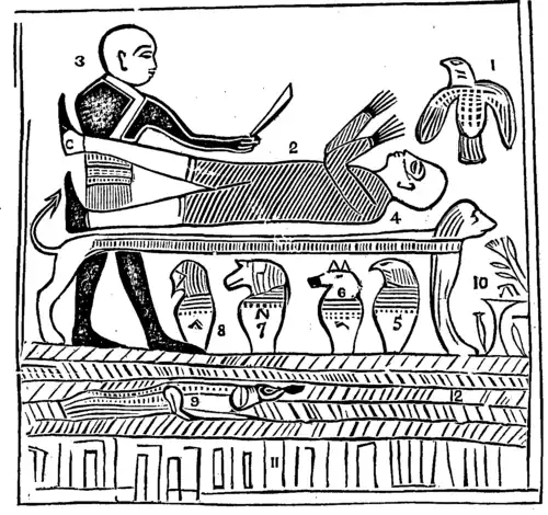 Fig. 1. The angel of the Lord. 2. Abraham fastened upon an altar. 3. The idolatrous priest of Elkenah attempting to offer up Abraham as a sacrifice. 4. The altar for sacrifice by the idolatrous priests, standing before the gods of Elkenah, Libnah, Mahmackrah, Korash, and Pharaoh. 5. The idolatrous god of Elkenah. 6. The idolatrous god of Libnah. 7. The idolatrous god of Mahmackrah. 8. The idolatrous god of Korash. 9. The idolatrous god of Pharaoh. 10. Abraham in Egypt. 11. Designed to represent the pillars of heaven, as understood by the Egyptians. 12. Raukeeyang, signifying, expanse, or the firmament over our heads; but in this case, in relation to this subject, the Egyptians meant it to signify Shaumau, to be high, or the heavens, answering to the Hebrew word, Shaumahyeem.