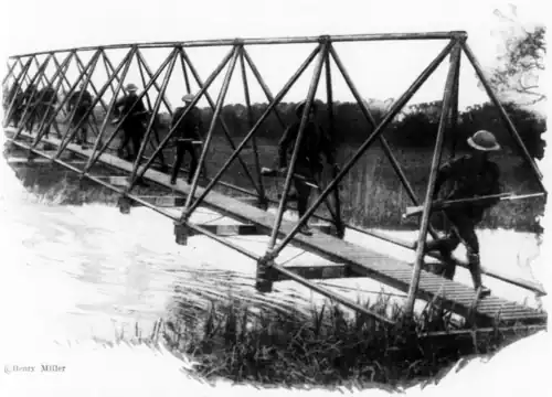 Crossing the Pipe Bridge; Soldiers on Maneuver Using the Portable Viaduct Which Is Quickly Assembled from Lengths of Piping and Is Strongly Braced