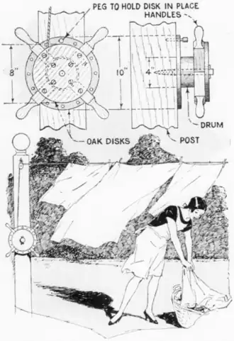 The clothesline reel shown in the illustration was designed by a woman who knew just what she wanted in the way of such a device. It can be adjusted to hold the line at the proper tension, is simple to make and can be instantly detached from the pole and carried in the house to keep the line dry in damp weather. The reel consists of a hardwood drum, 4 in. in diameter. On the back of the drum a hardwood disk, 10 in. in diameter, is fastened. Two hardwood handles, crossed and mitered at right angles, are fastened across the front of the drum, as shown. Over the handles a second hardwood disk, 8 in. in diameter, is attached. Disks, handles and drum are concentric with each other. A 8-in. hole is drilled through the exact center of the assembly and small holes 1 in. apart are drilled around the edge of the 10-in. disk. A lagscrew is driven into a convenient clothes pole 4 ft. from the ground, the head is filed off and a small hole is drilled through the end for a cotter pin. A pulley is also fastened to the top of the pole above the bolt. With the clothesline reeved through the pulley and run through holes in the other poles, the reel is placed on the bolt and the cotter pin inserted to prevent it from coming off. Then the line is reeled in until tight and a steel pin is inserted through one hole in the back disk into a hole in the pole. This holds the line taut. By removing the cotter, the reel can be instantly removed.—L. B. Robbins, Harwich, Mass.