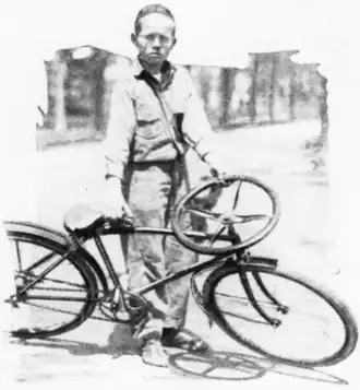The usual type of bicycle handlebars were not satisfactory to Paul Webber of Bedford, Mass., so he removed them and substituted a steering wheel taken from an old Ford. This, he says, is much better than the customary handlebars.—Arthur F. Egan, Boston.