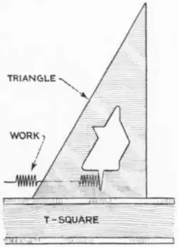 Draftsmen who make electrical diagrams find that the drawing of a large number of resistance symbols is a rather irksome task. If slots are cut in a 30°-60° triangle, as shown in the drawing, the task becomes simply one of working between two previously established guide lines.—Reuben Jensen, Silverton. Oregon.