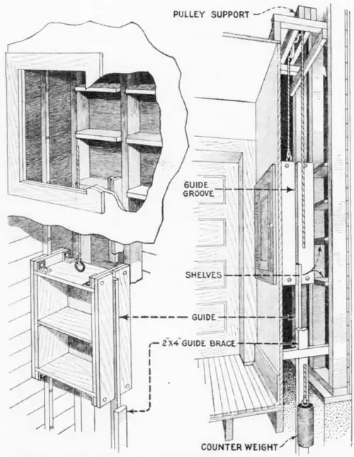placed the materials used for making the lift on one end of a plank, pivoted in the center, to balance the counterweight on the other end. When both weights were equal, I added about 8 lb. to the counterweight. Then I proceeded to build the lift, which was made with double sides, top and bottom in order to make it solid and heavy. Ordinary 1 by 6-in. lumber was used. Angle iron may be used to add weight and rigidity but it must be rememhered that no additional material must be used besides that which was balanced with the counterweight. Between the two boards forming the side, a groove is left for the guide, on each side. The pulley assembly is then made. It must be carefully calculated where the ropes and weights are to hang in order to be sure that they clear the lift while in motion or at rest, and the weight must be hung in a position where it can do no damage if it falls. The pulleys need be of no special size; anything from 2 to 7 or 8 in. will do. They must, however, be of the grooved type and able to retain a 3⁄8-in. rope. Lengths of pipe or rod make good axles. I used one 2-in. and two 4-in. pulleys, the rope passing over the large ones and under the small one to provide the necessary friction to hold the waiter steady at the top or bottom, yet allow it to move freely when pulled up or let down. Ordinary sash cord is well suited for use in a dumb-waiter.