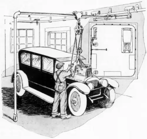 The crane shown in the accompanying drawing has a wide range of travel and is capable of transferring heavy units from the bench to the machines and to the several cars being repaired. It uses the same track as employed to support the hanging doors at the front of the garage. The provision of such a track around the four walls, is the main support for the crane. A double hanger with swivel rollers allows the crane to travel along the continuous runway. The corners are traversed on a curved track, similar to the track on which the door is supported when swung from the front to the side. A cross rail extends from these hangers and rests on a vertical support of pipe, provided with a fixed roller at the bottom. The hoist is carried by a trolley on the cross rail, which permits placing the hoist directly above the load. While every advantage of a crane is provided, the single leg, reaching to the floor, does not encroach on the available floor space, as is usually the case with four-legged portable cranes.