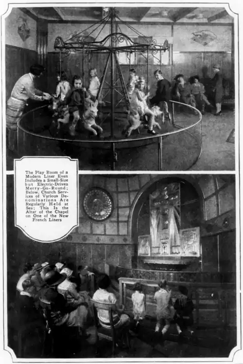 The Play Room of a Modern Liner Even Includes a Small-Size but Electric-Driven Merry-Go-Round; Below, Church Services of Various Denominations Are Regularly Held at Sea; This Is the Altar of the Chapel on One of the New French Liners