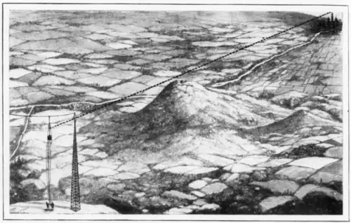 Because of their straight-line propagation and the shadow effect of interfering objects, unusual arrangements were necessary in the experiments with the five-meter waves. The transmitter, instead of being housed in a building or placed on the ground, was swung in the air from the top of a 300-foot aerial mast at Schenectady. An endless rope, running over a pulley on the condenser dial, made tuning possible from the ground, operating much like a chain hoist. The small output meter, fixed to the antenna, was read from the ground through a surveyors' transit. Wires dangling from the transmitter connected to the current supply on the ground.