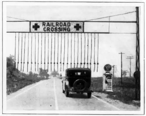 For the further protection of motorists, safety experts have gone to the railroads for an additional device to warn drivers of hazardous grade crossings. This unit is the overhead strap line, similar to that used on the railroads for many years at approaches to tunnels and low viaducts, warning brakemen, or others on top of the cars, to duck their heads. The strings
