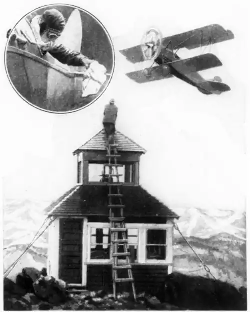 No one experiences greater joy at the arrival of the mailman than the forest lookout at his lonely post in the western mountains, but the sky, not the roads, is watched in this case, for the mail is delivered by plane. Special orders from the chief as well as other communications are dropped in a small package as the airplane, maintained by the forest-patrol service, glides down near the lookout tower and then zooms away for another delivery, miles away.