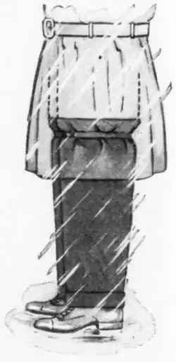Waterproof protectors for trouser legs, which can be slipped on in a few seconds and carried in the pocket when not in use, have been introduced in England. They are simply pulled on over the shoes, button in front and keep the trousers dry from the knee to the shoe top. An elastic band holds them in place at the top, as shown.