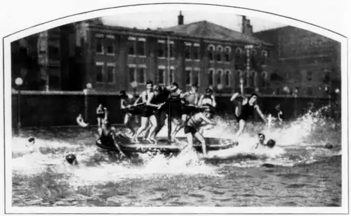 Bathers at a municipal natatorium in Davenport, Iowa, have fun on a push wheel that shoots persons seated on it into the water after it has attained sufficient velocity. Beneficial exercise is received in rotating it, and the riders have sport in trying to stay on as long as possible, although a final ducking is almost certain.