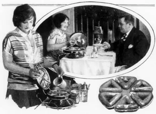 Fresh, hot "triangle" doughnuts at the breakfast table, cooked as they are needed, are now possible in an electric mold of aluminum. It is operated from a lighting socket in much the same way as a waffle iron and can also be used for baking muffins and small cakes. Another table convenience is an aluminum griddle for cooking eggs, and frying bacon, ham or hot cakes. It has a roomy cover for keeping the food warm and, since no grease is required, may be employed at the table while eating. Both articles are of attractive appearance with a decorative base and high polish. The ware is of cast aluminum, and one can cook without water in other utensils of the same material, so none of the beneficial ingredients of the foods are lost.
