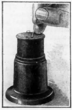 Waste of time, pricked fingers, and other unpleasant features, are avoided in a special holder for office pins. It has a top so arranged that when it is pressed, a pin emerges bead first from a little opening where it can be grasped with the thumb and forefinger, ready for immediate use. The container holds 200 pins, is attractively finished and does not spill the pins, as they come in special refill tubes ready for insertion in the holder.